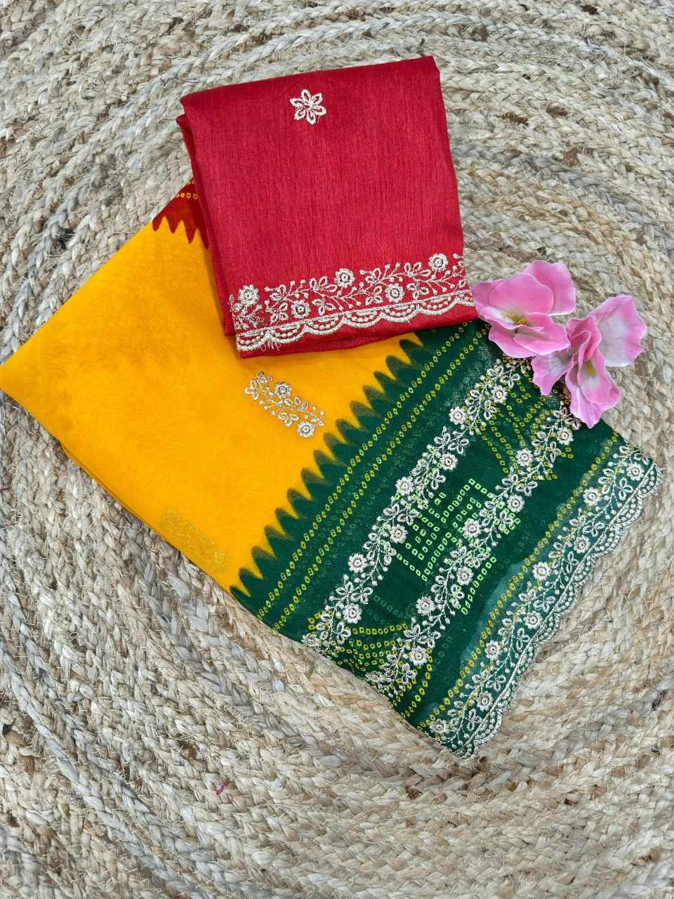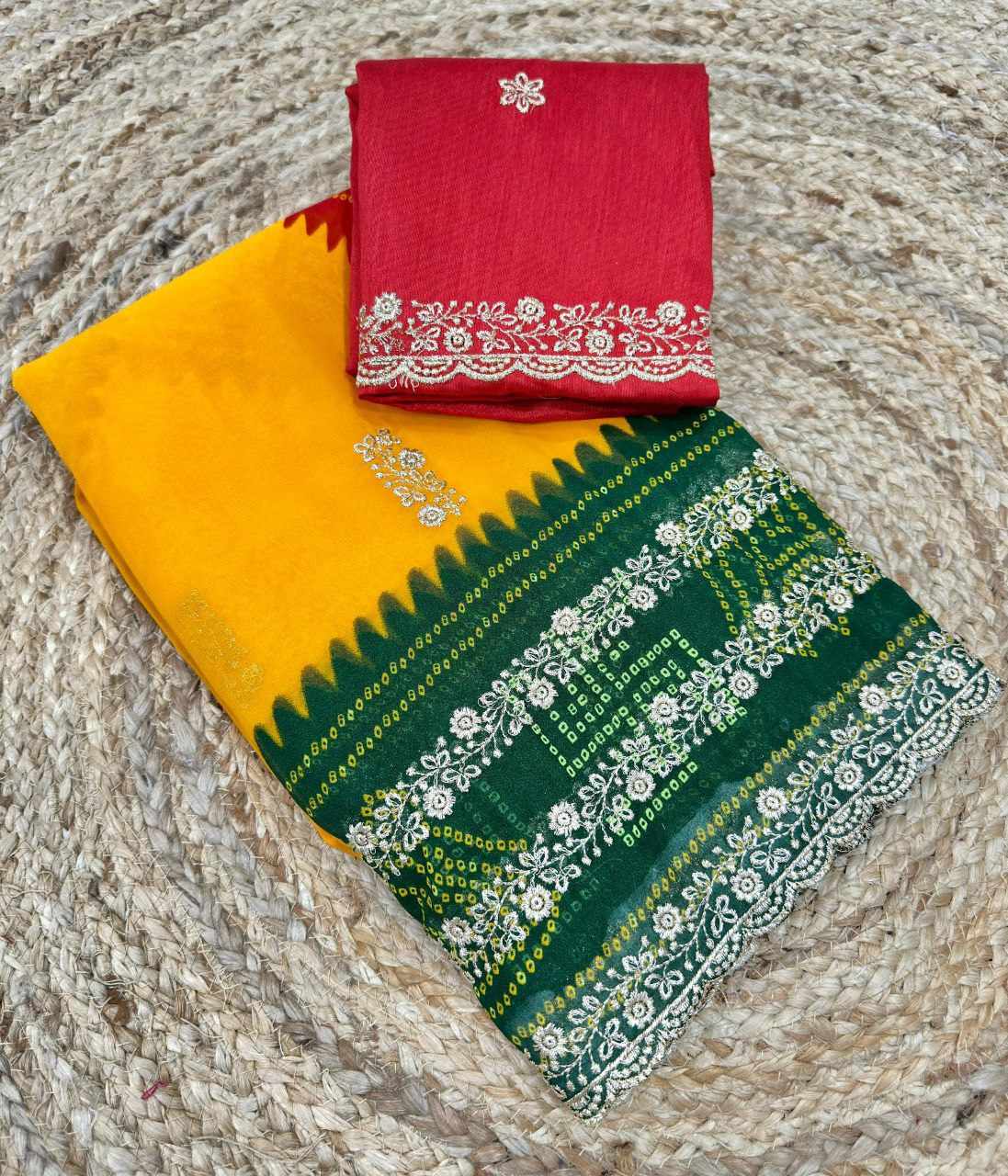 | Name : | PIYU P1052 LEHERIYA BANDHANI-1 Yellow-Green Saree |