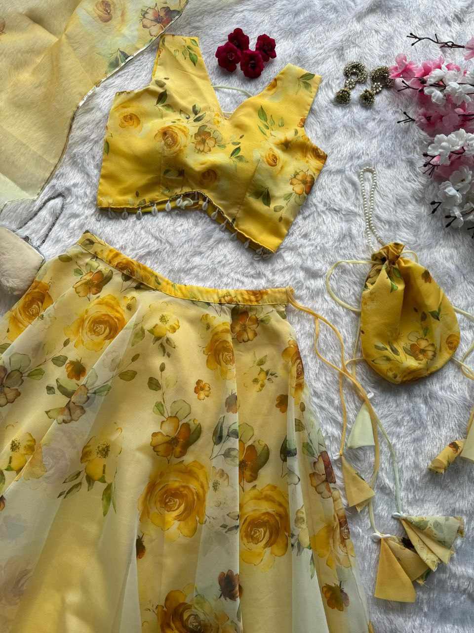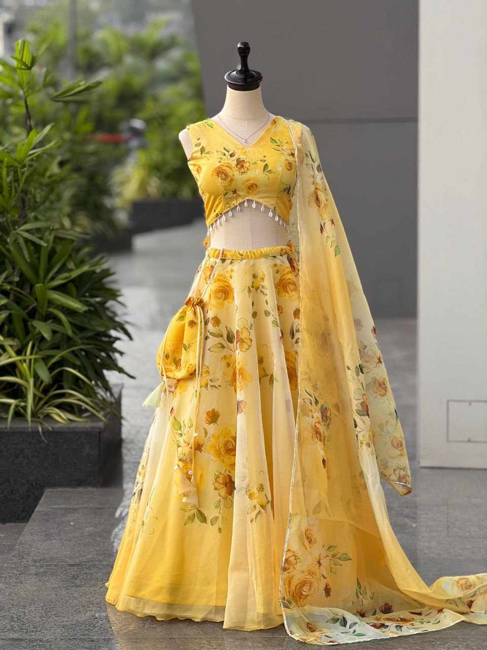 Lehenga – Pure organza silk digital printed lehenga with a grand 8-meter flair. Finished with canvas patta for a perfect flare